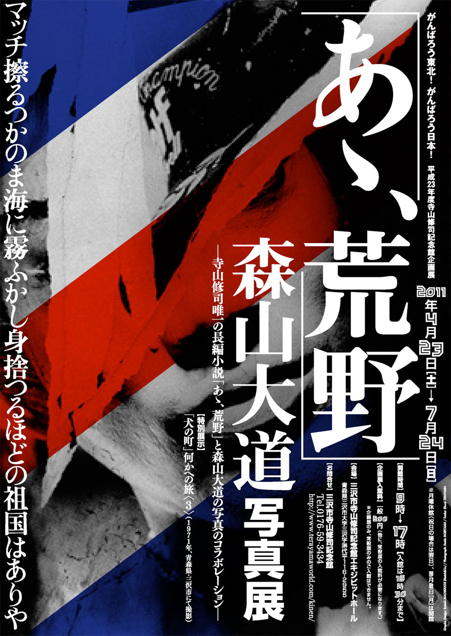 本展は、寺山修司の遺した唯一の長編小説「あゝ、荒野」(1966)と、森山大道の時代を鋭く記憶した写真とのコラボレーションです。森山大道が60年代から撮影してきた貴重なオリジナルネガから自らプリントした211点を新たにちりばめ、装い新たに生まれ変わった新装版の「あゝ、荒野」(2005年/パルコ出版)。今回の展示はその時プリントされた貴重な写真から構成されます。「60年代」、「アングラ」、「新宿」というキーワードでの、再検証と憧れの高まる今、寺山×森山の「60年代新宿荒野図」の世界へ・・・・・。あなたの荒野は・・・・・・・。