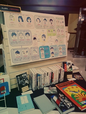 寺山の著作本の紹介だけでなく、寺山略年譜や人物相関図のパネル展示、関連書籍の紹介など充実のラインナップです。気になった書籍は、もちろん借りることができます。3月31日まで。